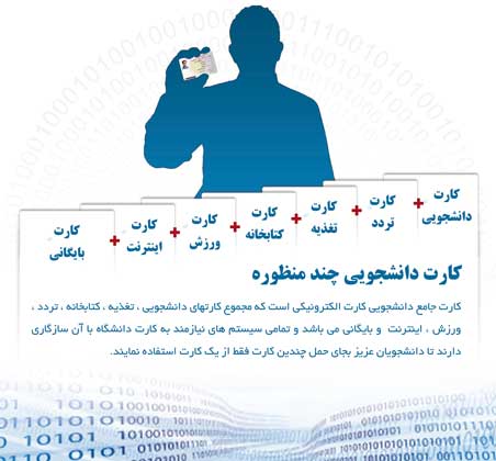 کارت جامع دانشجویی کارت هوشمند چند منظوره میباشد که بعنوان کارت دانشجویی، کارت غذا، کارت کتابخانه و... استفاده شده و سرویسهای دیگری همچون اعلام شماره صندلی، سیستم نوبت دهی آموزش، حضور و غیاب امتحانات، بن خرید کتاب و نرم افزار و پرداختهای خرد داخل دانشگاه نیز با این کارت انجام خواهد پذیرفت.